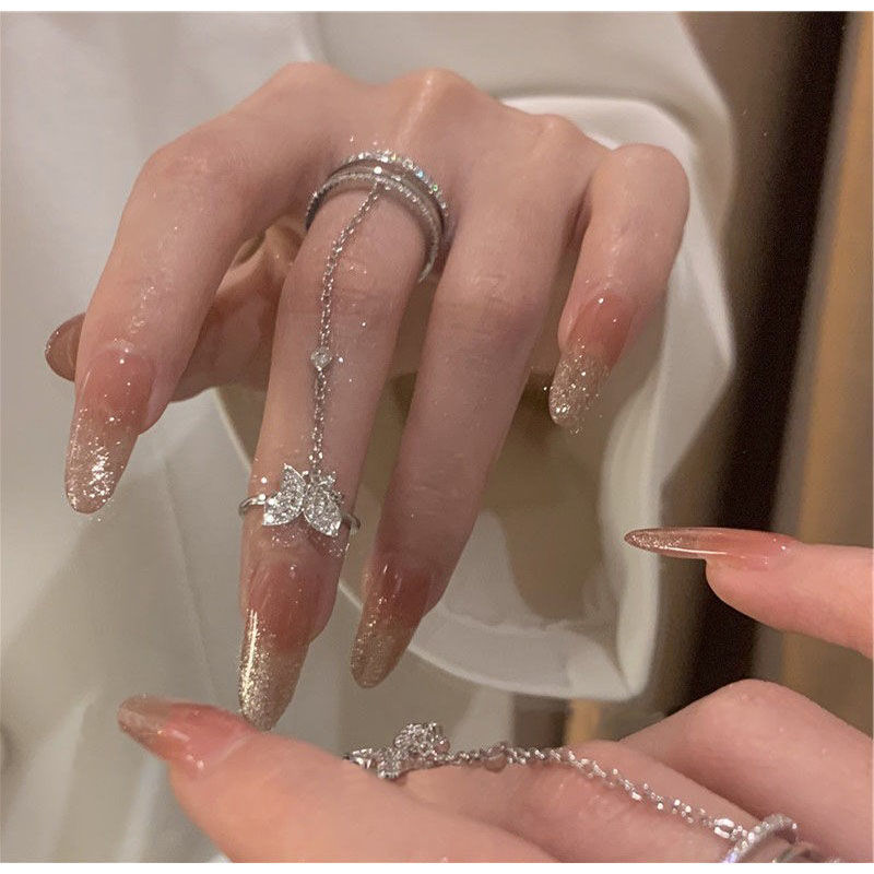 Cold Style Fashion High-grade Siamese Ring Women's Niche Design Sense One-piece Light Luxury Butterfly Chain Strap Double Ring