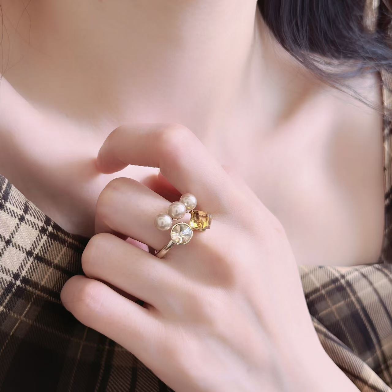 Maillard Pearl Sugar Cube Open Ring for Women, Niche Design with a Sense of Light Luxury, Fashionable Index Finger Ring Accessory