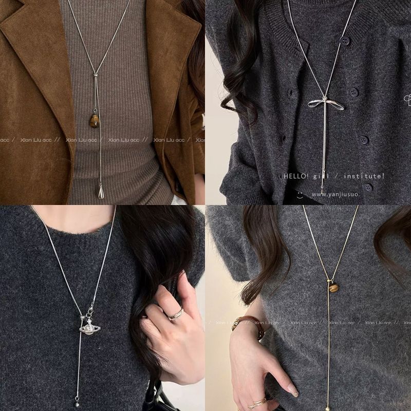 Tiger Eye Stone Water Drop Pull Necklace Women's 2025 New Hot Style Light Luxury Niche Design Long Sweater Chain Accessories