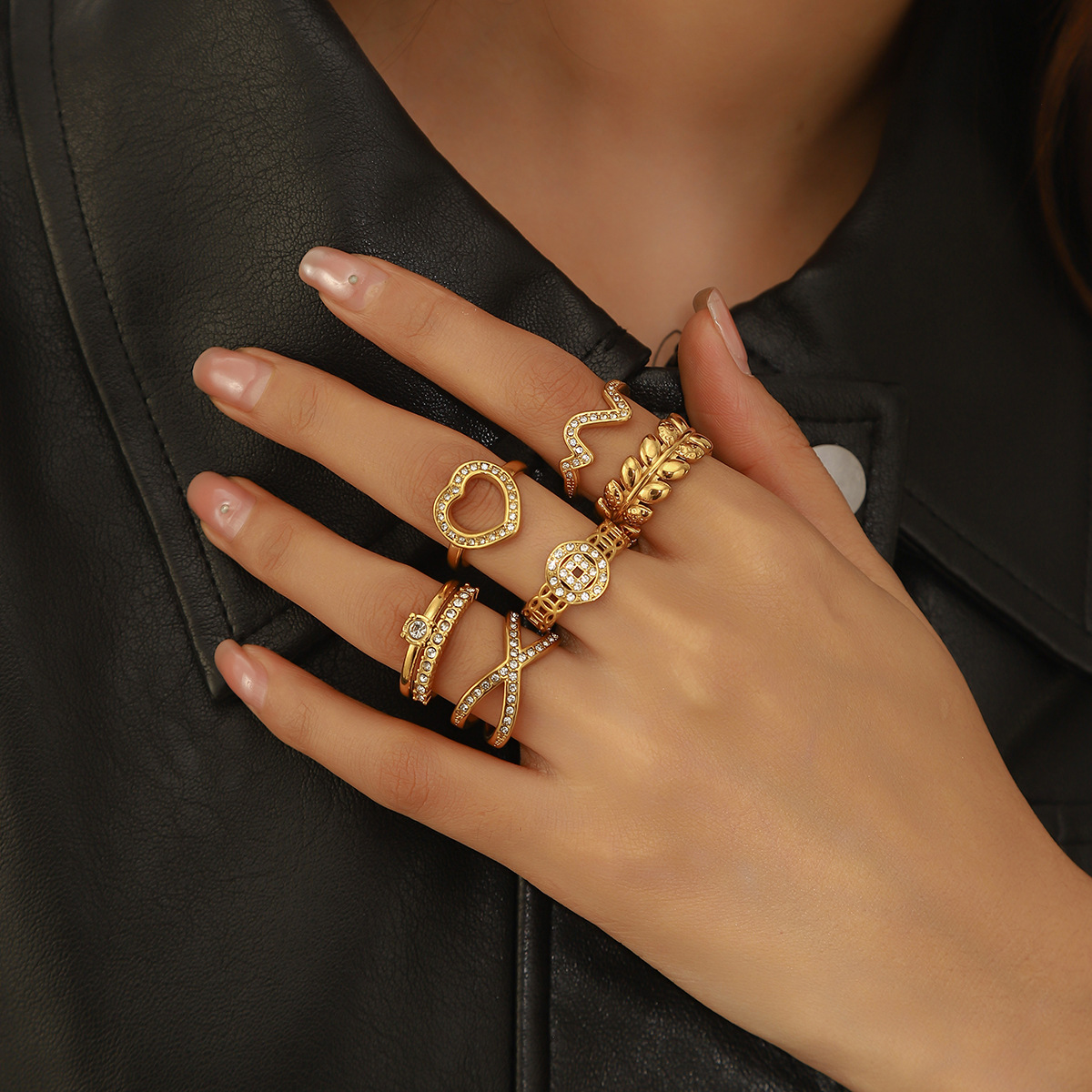 Myya Stainless Steel Diamond-Encrusted Geometric Ring Set Retro Niche Design Wholesale Fashion Women's Rings