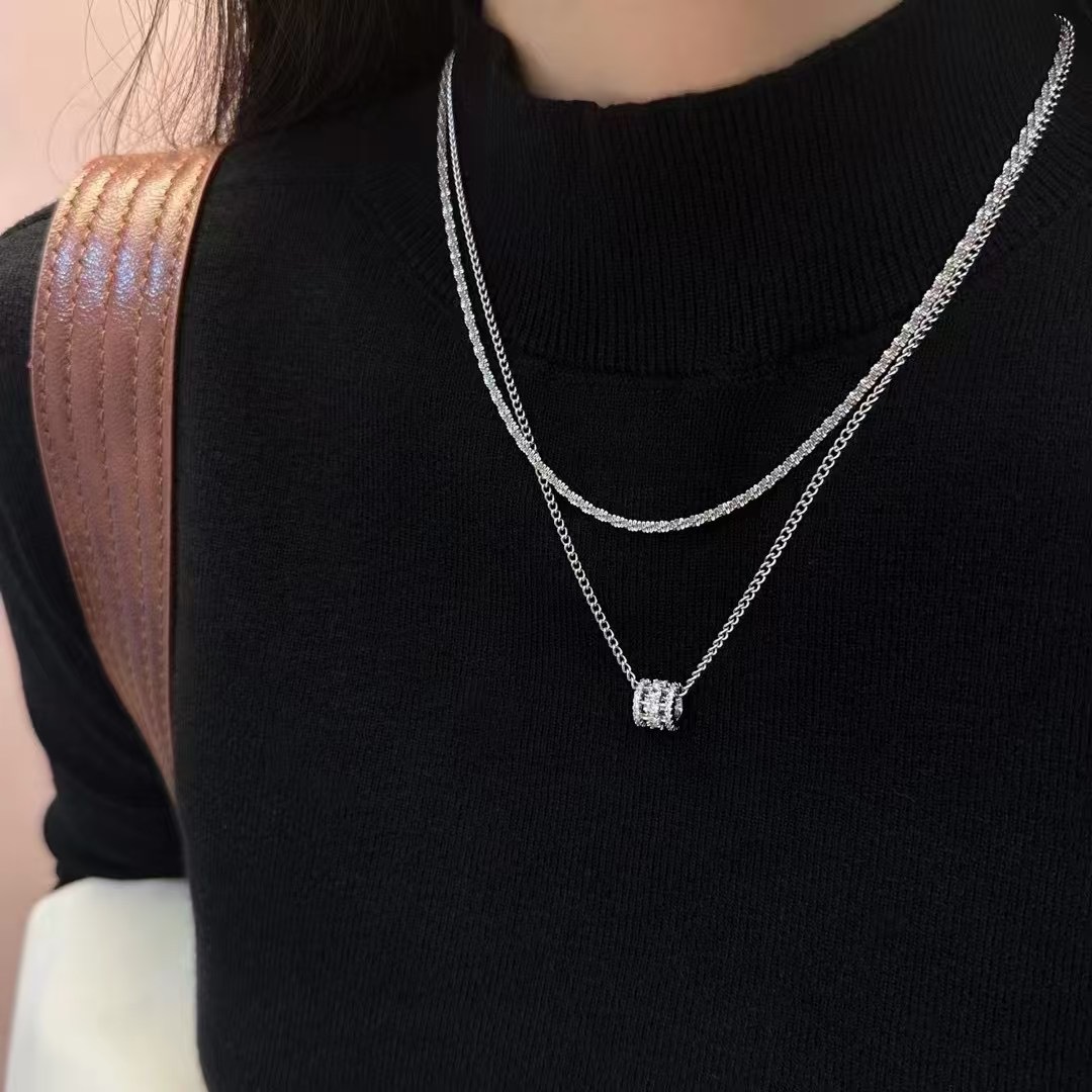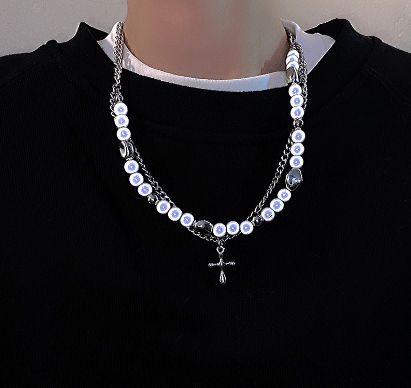 Men's and Women's Hip-Hop Cold Style Necklace Niche Design Sense Beaded Cross Reflective Beads Double Layer Stacked Sweater Chain