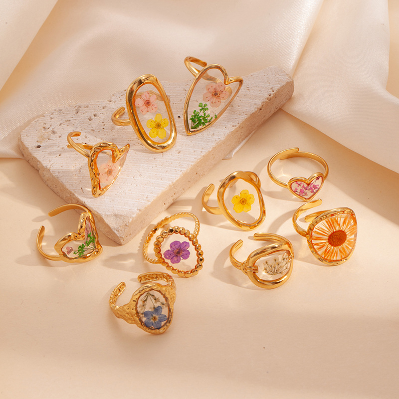 Cross-Border New Handmade Dried Flower Ring Women's Niche Design Ring Heart European and American Style Fashion High-End Jewelry
