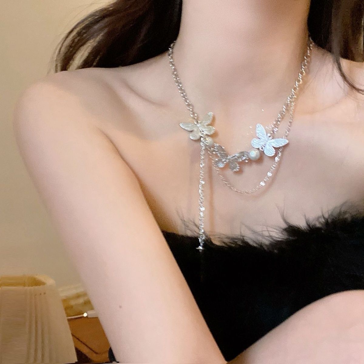 Sweet Cool Style Butterfly Four Mans Star Pendant Tassel Necklace Ins Fashion Clavicle Chain Design Sense Niche Necklace Elegant