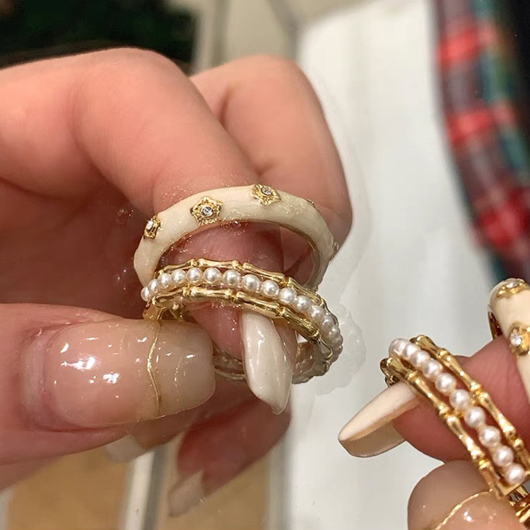 European and American Cross-border Titanium Steel Ring Retro Light Luxury Pearl Golden Multi-layer Line Design Sense Niche All-match Ring for Women