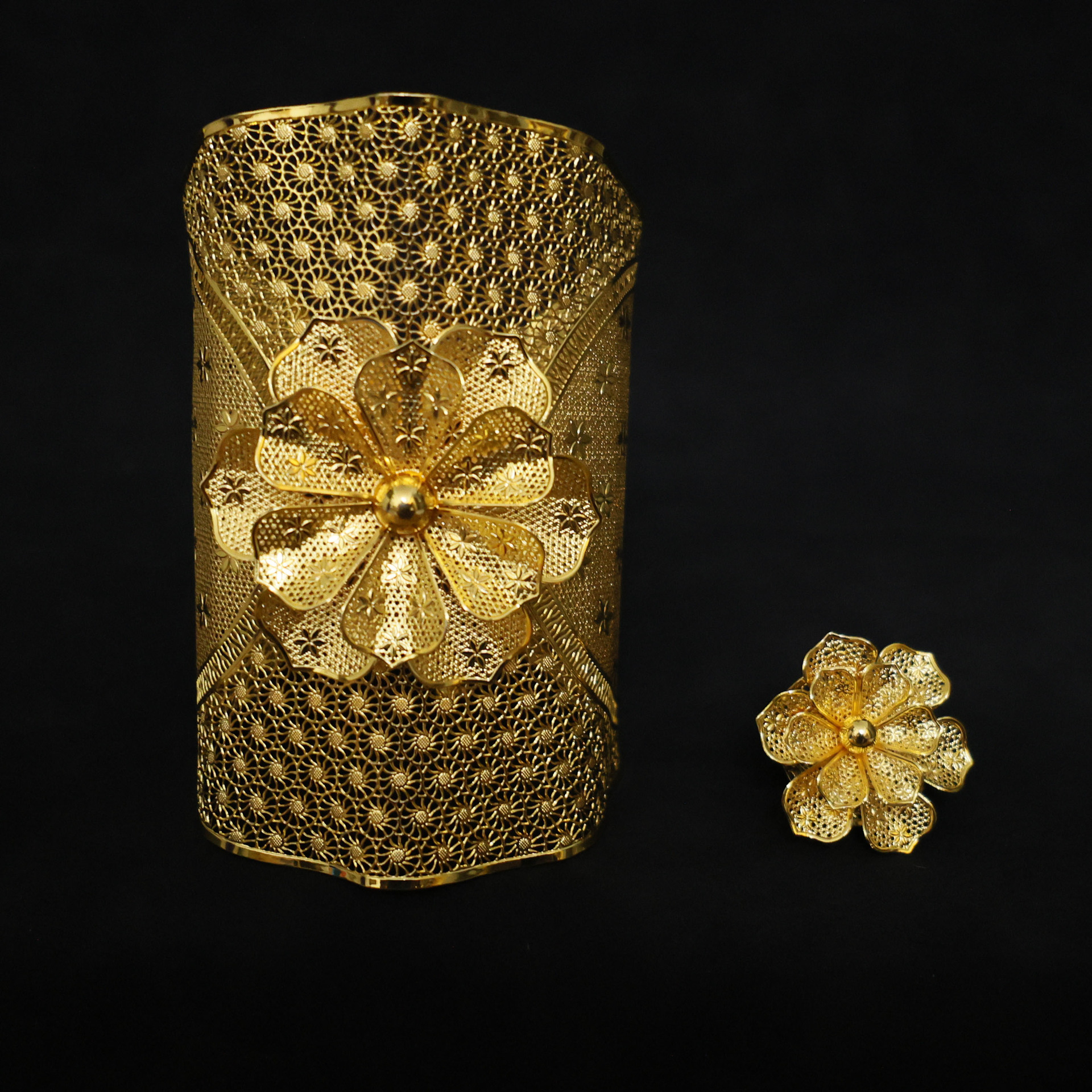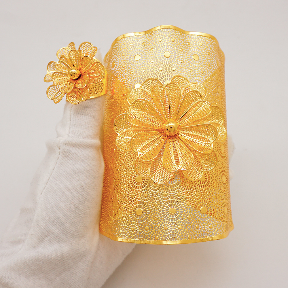 Dubai Gold-Plated Large Bracelet Ring Set Hollow Computer Engraved Middle Eastern Women's Wedding Fashion Bracelet