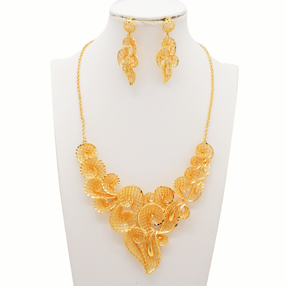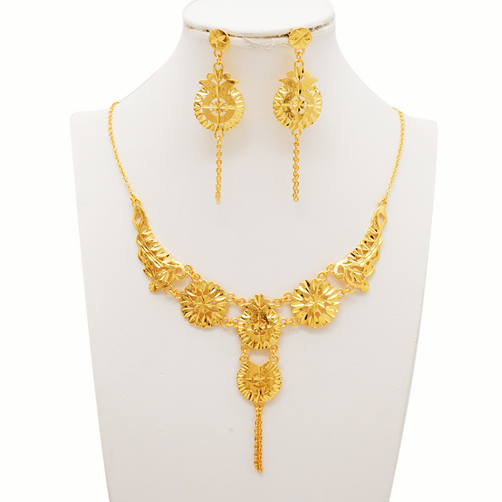 Cross-border Hot Sale Dubai Luxury 24K Jewelry Necklace Earrings Two Piece Set Bride Wedding Factory in stock Batch
