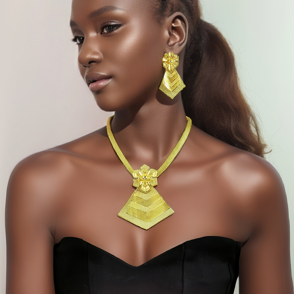 African Women Jewelry Set 24K Gold Big Flower Geometric Pendant Necklace Earrings Set Dubai Wedding Beads