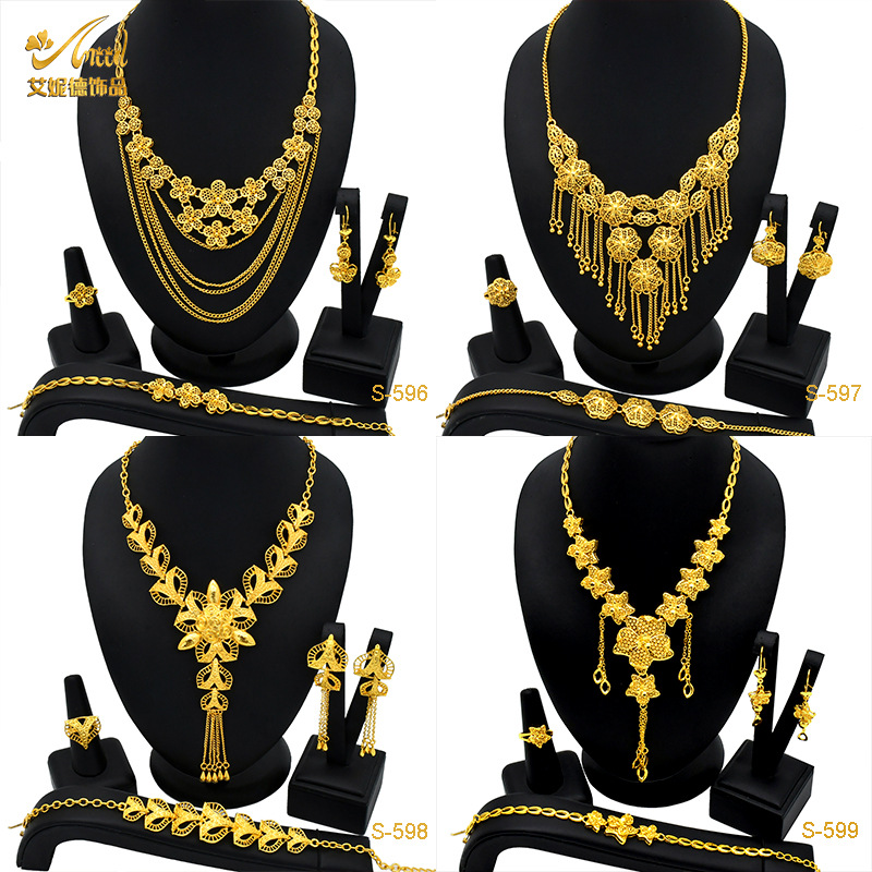 Dubai African wedding jewelry copper jewelry suit earrings ring bracelet long necklace flower pendant chain jewelry