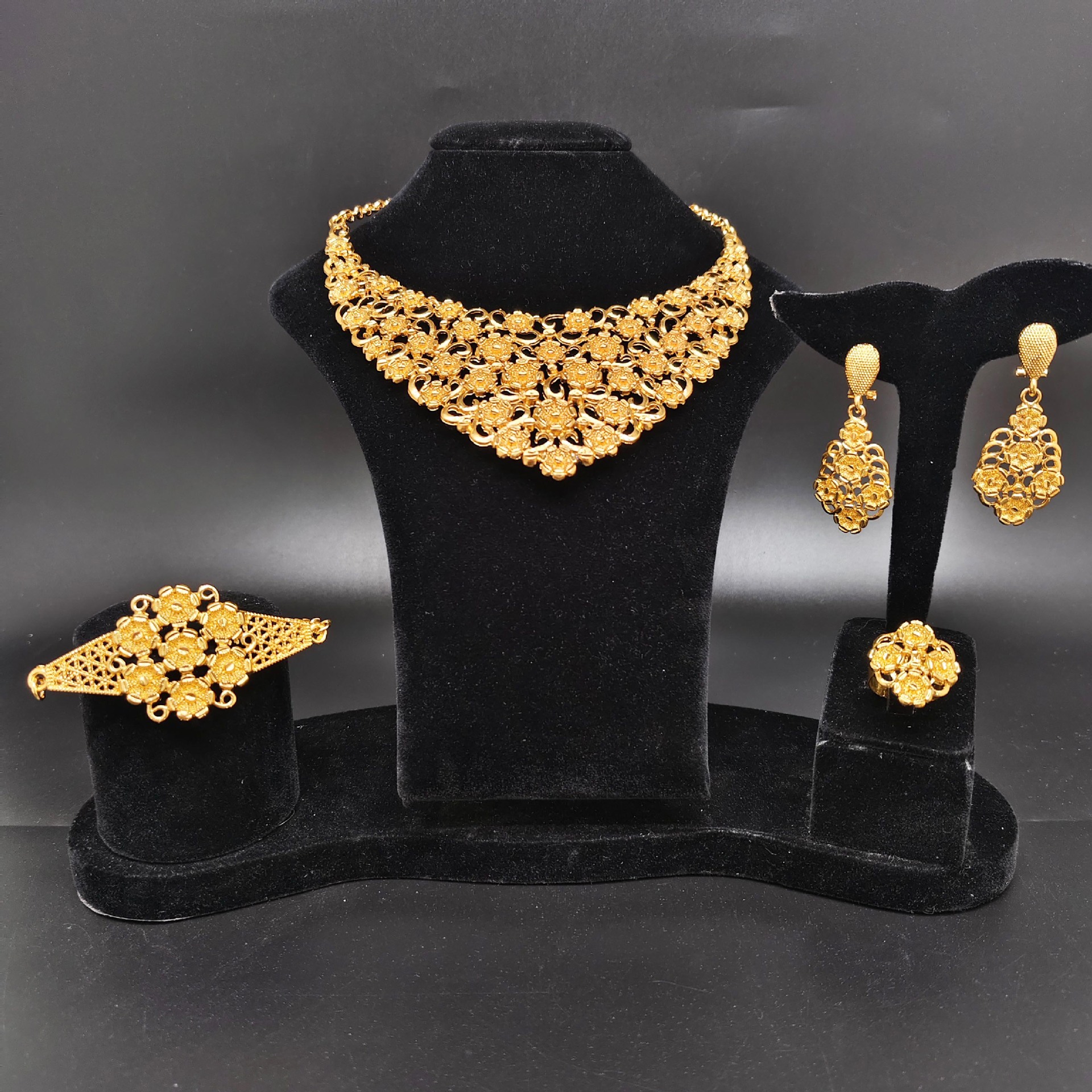 Cross-border Middle East Plated 24K Gold Flower Necklace Earrings Ring Bracelet suit Dubai European and American Bride Wedding Jewelry