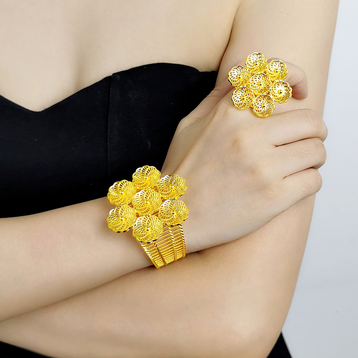 2024 new European and American metal suit bracelet ring female trend big flower design Dubai jewelry party wholesale