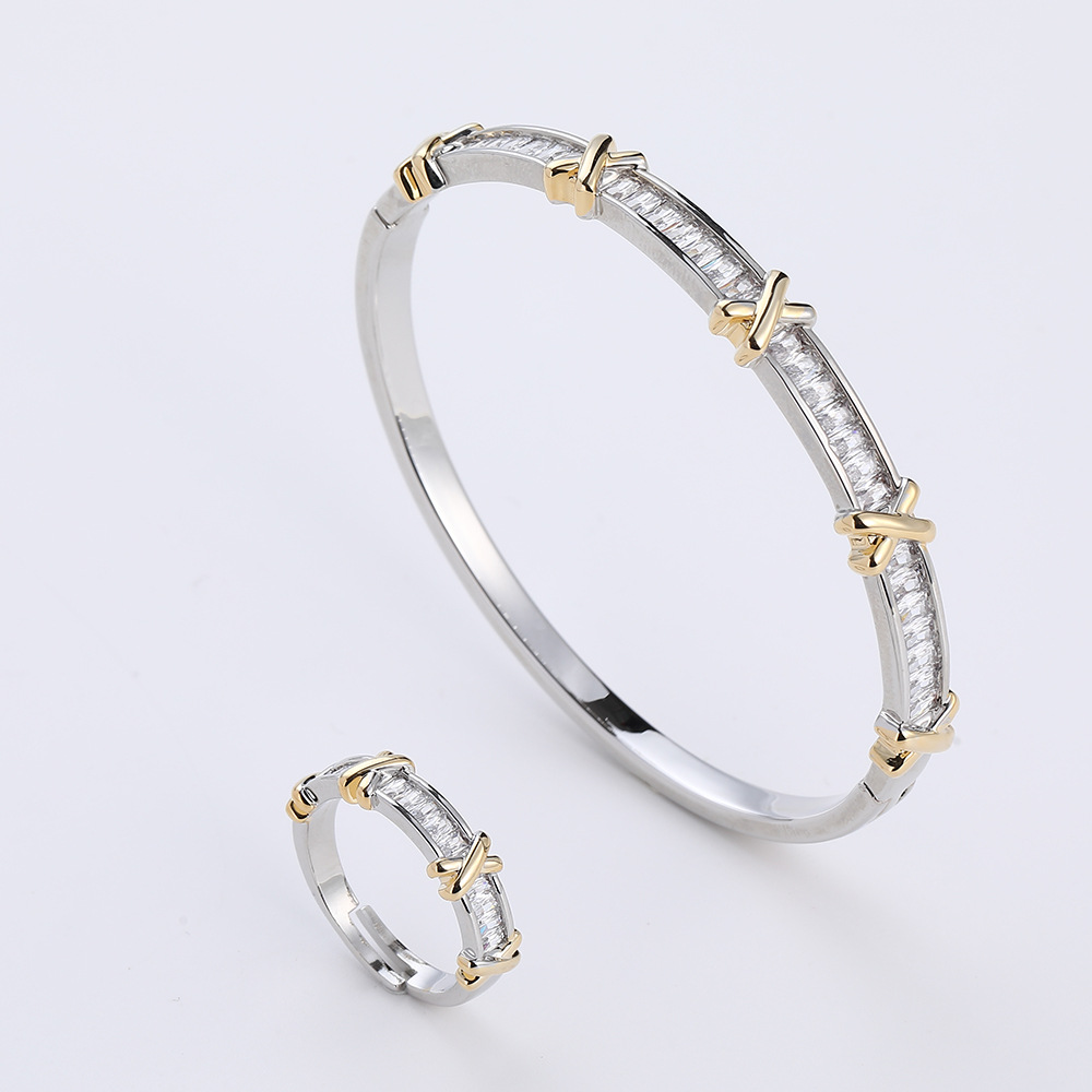 Light Luxury Square Zirconium X-Shaped Cross Ring Bracelet Jewelry Set Bangle Girls High-End Aaa Zircon Hand Jewelry