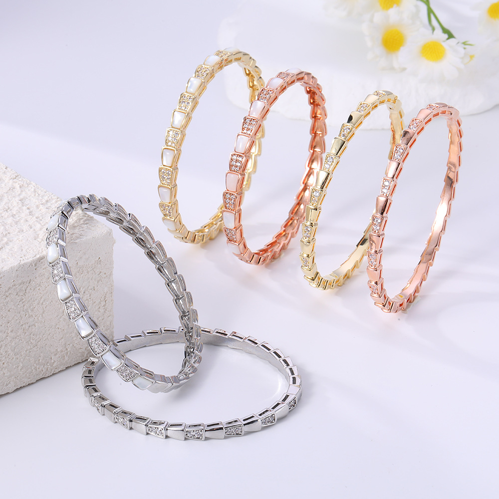 High Version Classic Snake Bone Bracelet for Women, Natural White Mother-Of-Pearl Large Zircon Inlaid Bracelet for Women, Real Gold Electroplated Hand Jewelry
