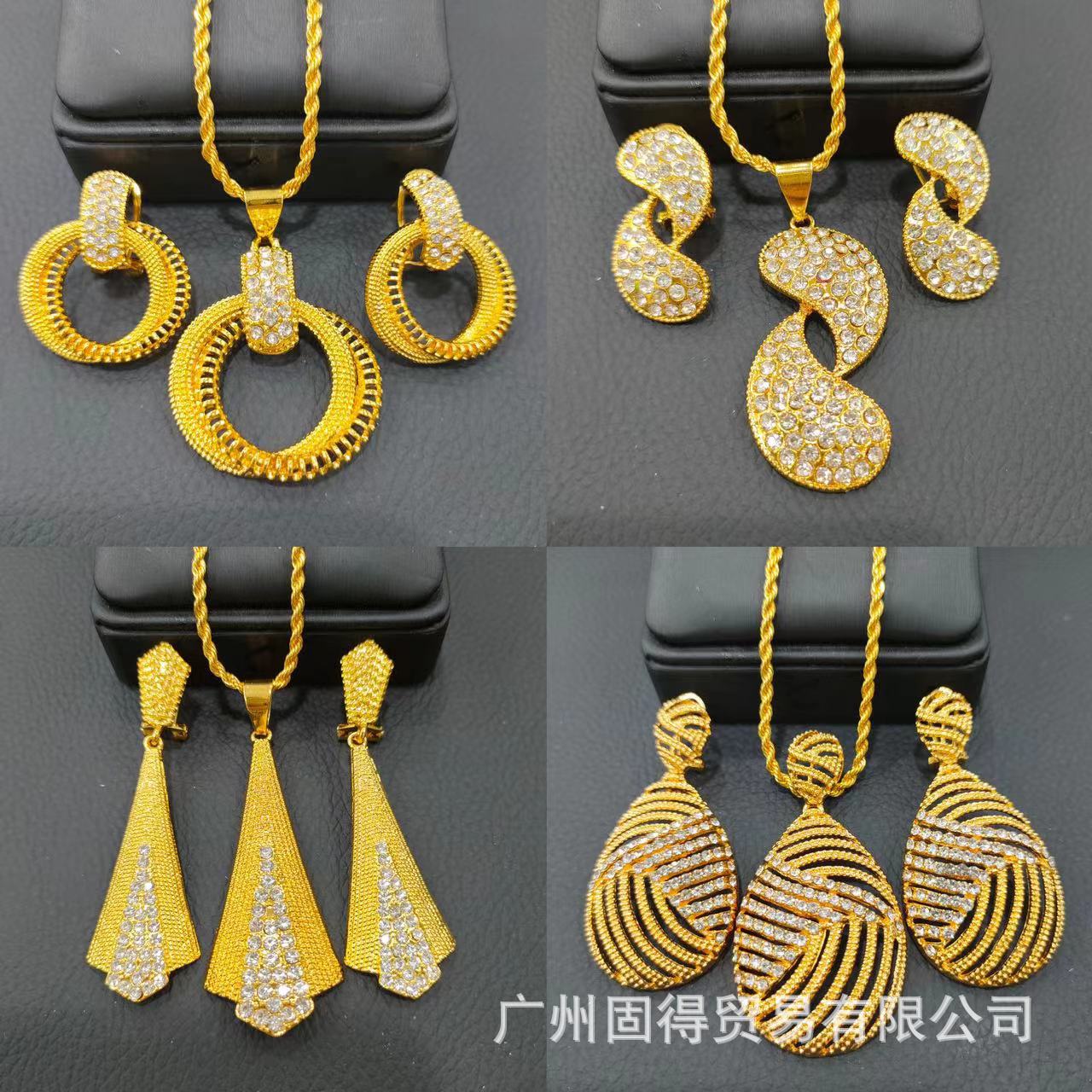 Dubai 24K Gold Full Diamond Necklace and Earrings Set for Women Cross-Border Nigerian Bridal Fashion Jewelry Two-Piece Set