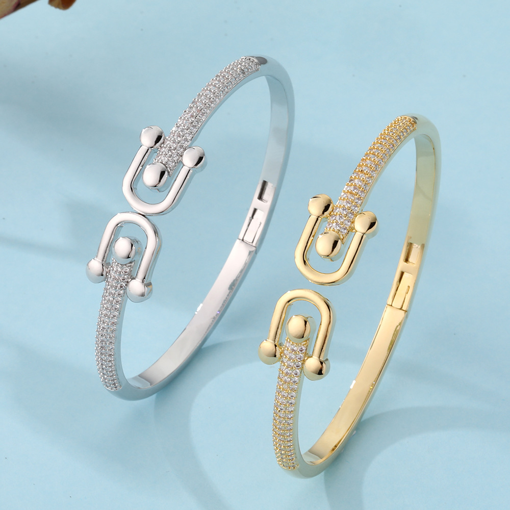 Cross-Border Popular Open Horseshoe Buckle Bracelet Copper Plated Real Gold Women's Bracelet Light Luxury High-End Versatile Full Diamond Bracelet