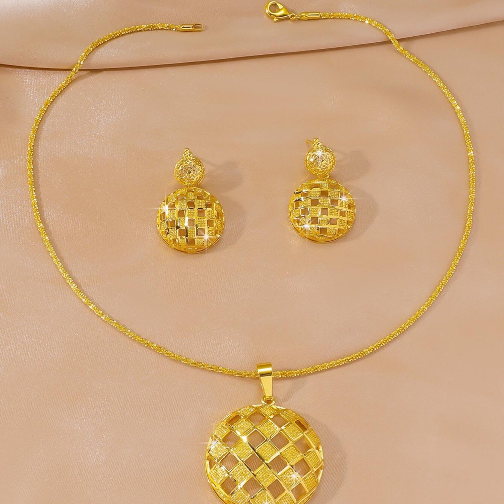 Fashionable Sand Gold Dubai Geometric Grid Round Wedding Jewelry Earring Set Light Luxury Cross-Border New Product Temperament Personality