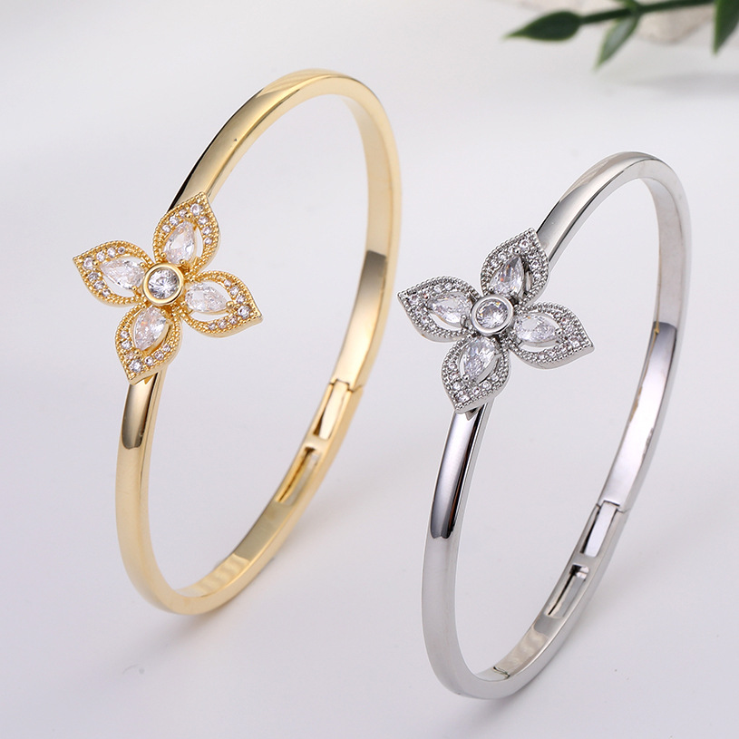 Four-Petal Flower Four-Leaf Clover Open Bracelet, Accessible Luxury and High-End Zircon Water Drop Flower Bracelet, Niche Design Hand Jewelry
