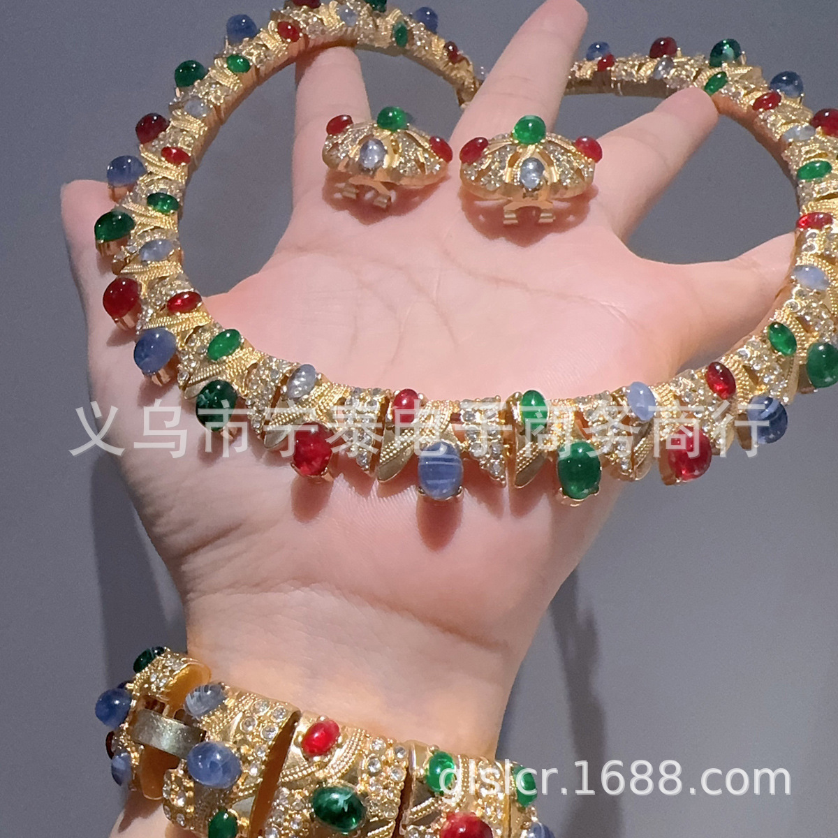 Medieval Bronze Plated Thick Gold Inlaid with Colored Gems Natural Stone Dubai Ball Gorgeous Dress Wedding Bride Ladies Jewelry Set