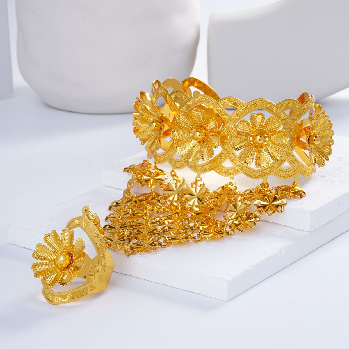 Dubai 24K Gold Plated Large Bracelet Ring One-Piece Jewelry Set African Middle Eastern Women's Wedding Bridal Jewelry