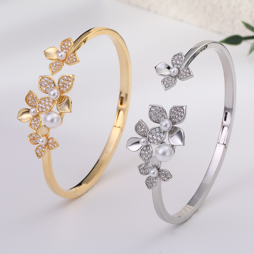 Korean Style Micro-Paved Zircon Flower Bracelet for Women, Light Luxury and High-End Open Pearl Bracelet for Women, Four-Leaf Clover Bracelet Wholesale