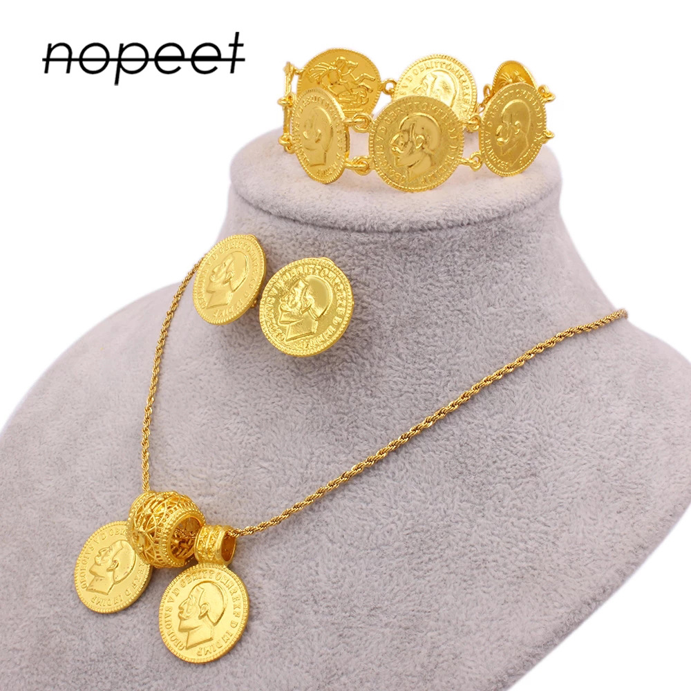 NOPEET Dubai jewelry set 24k gold Women large coin pendant necklace earrings bracelet African bride gift