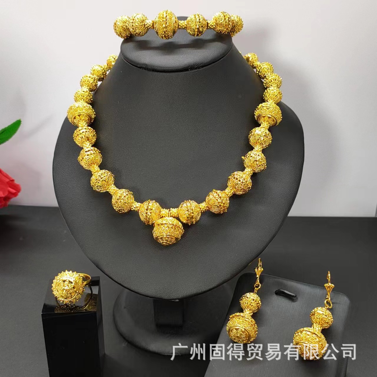 Dubai Jewelry 24K Gold New Bridal Jewelry Necklace Earrings Bracelet Ring Ball Alloy Jewelry Set Wholesale