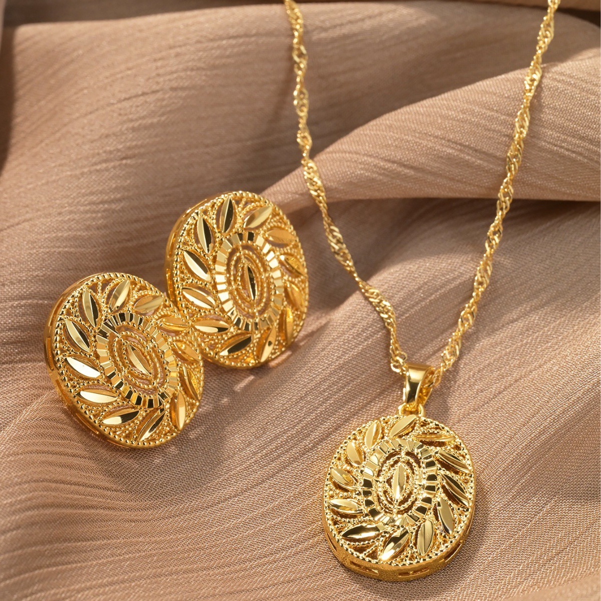 Dubai Bride 24k Gold Plated Round Necklace Earrings Jewelry suit Middle East Africa Ladies Jewelry Wholesale