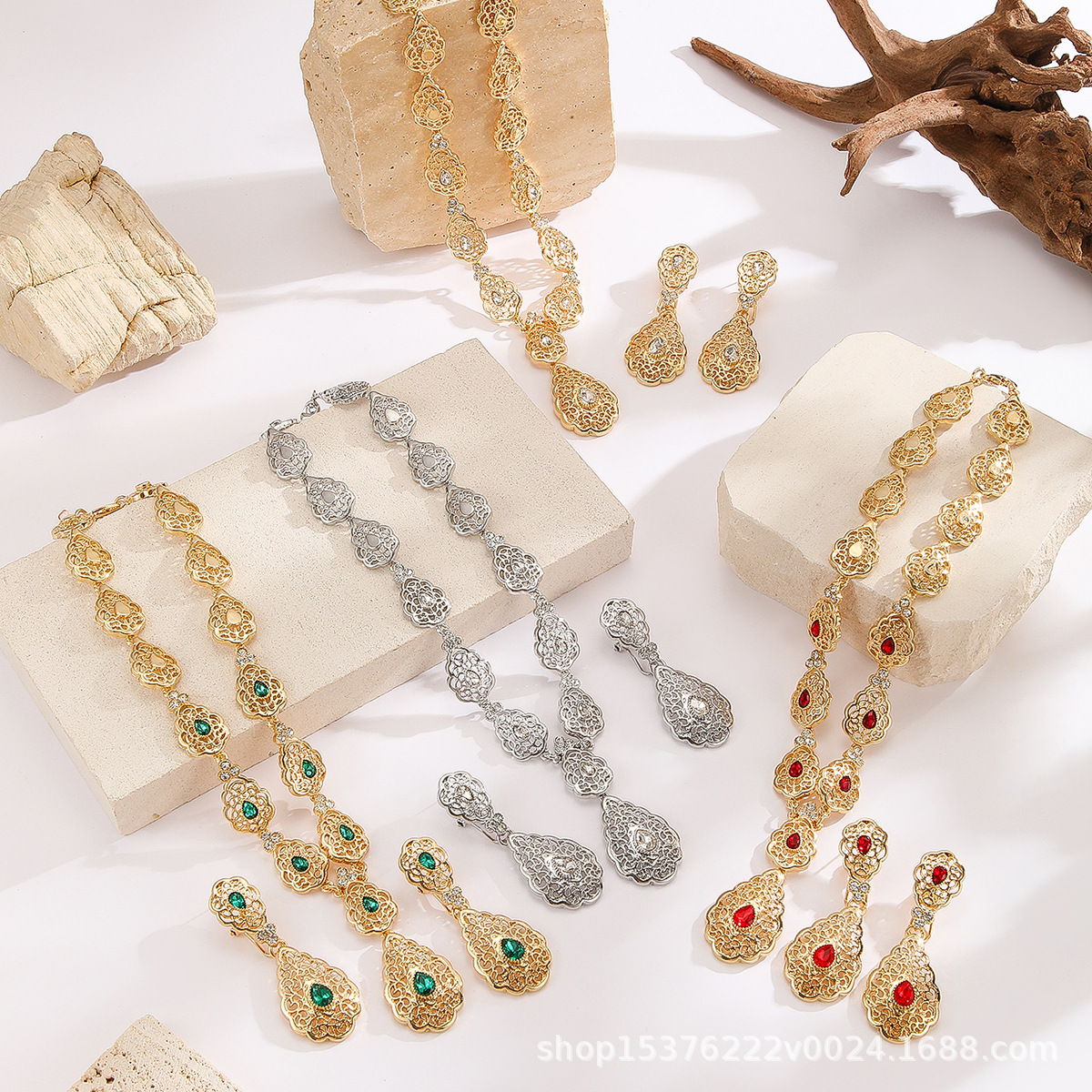 Cross-Border European and American Water Drop Set Middle East Dubai Bridal Jewelry Set Chain Gold Hollow Earrings Necklace Hot Selling Jewelry