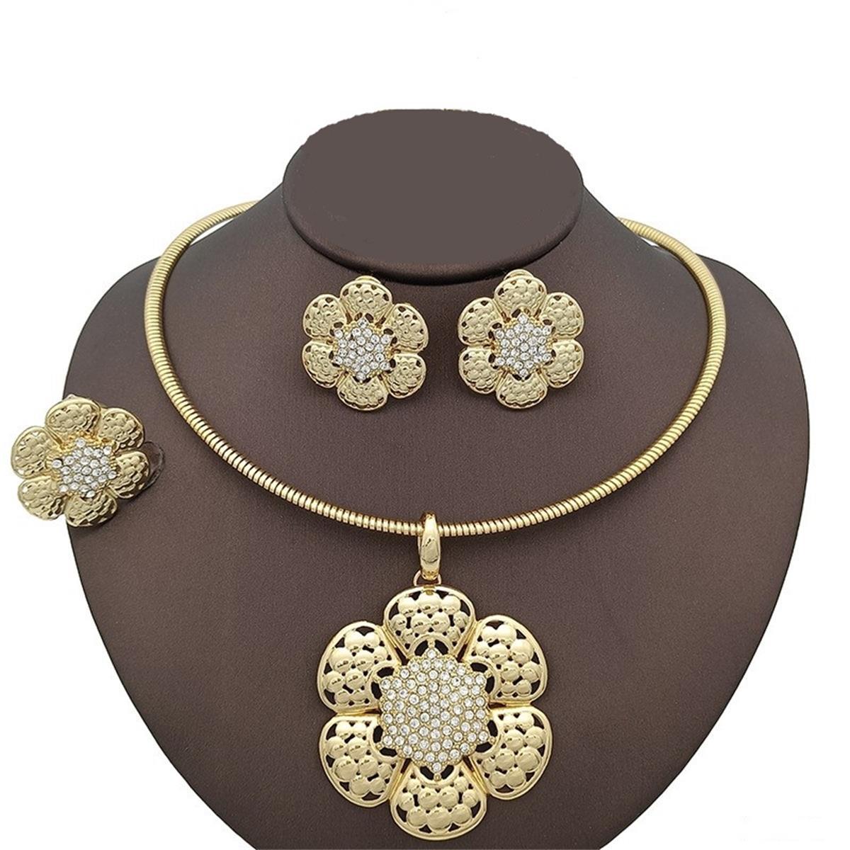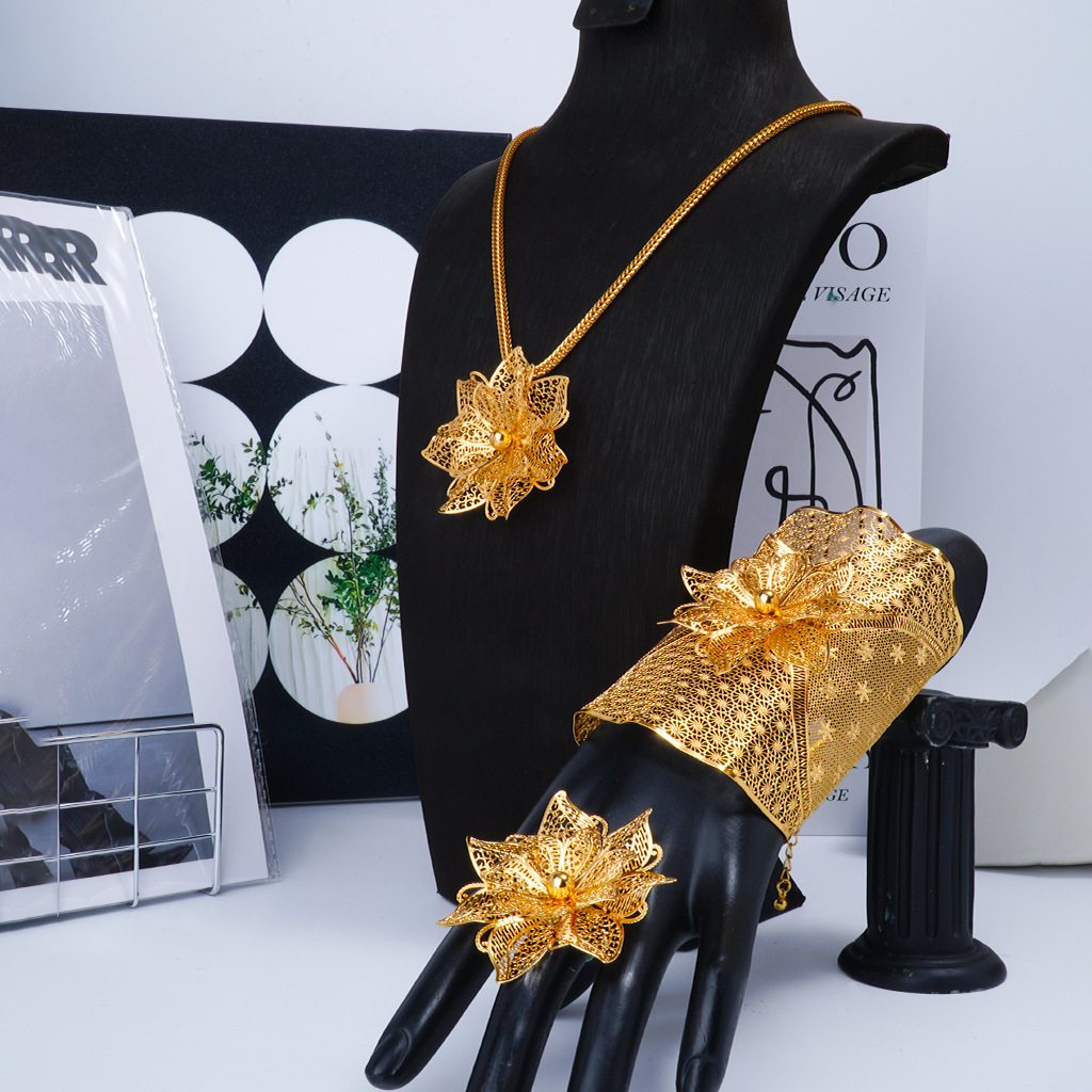 Flower Bracelet, Ring, Jewelry, Necklace Set, 3-Piece Set, 24K Gold Plated Brooch, Special Edition, Dubai Bride Wedding