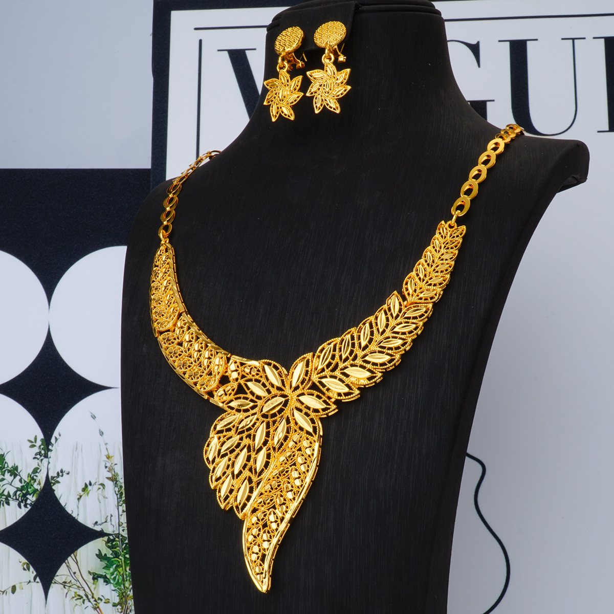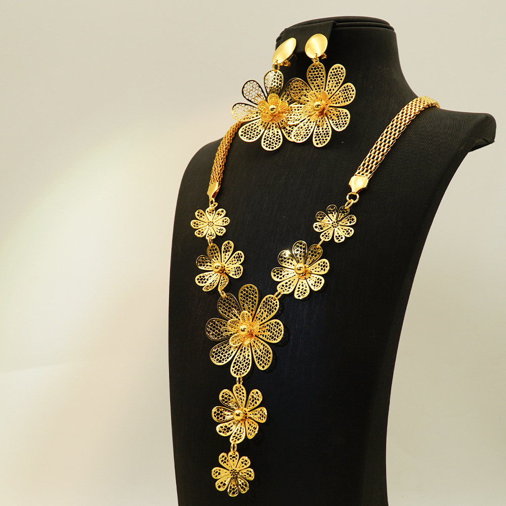 Dubai Gold Plated Hollow Exaggerated Flower Necklace Earrings Jewelry suit Women Wedding Fashion Jewelry Accessories