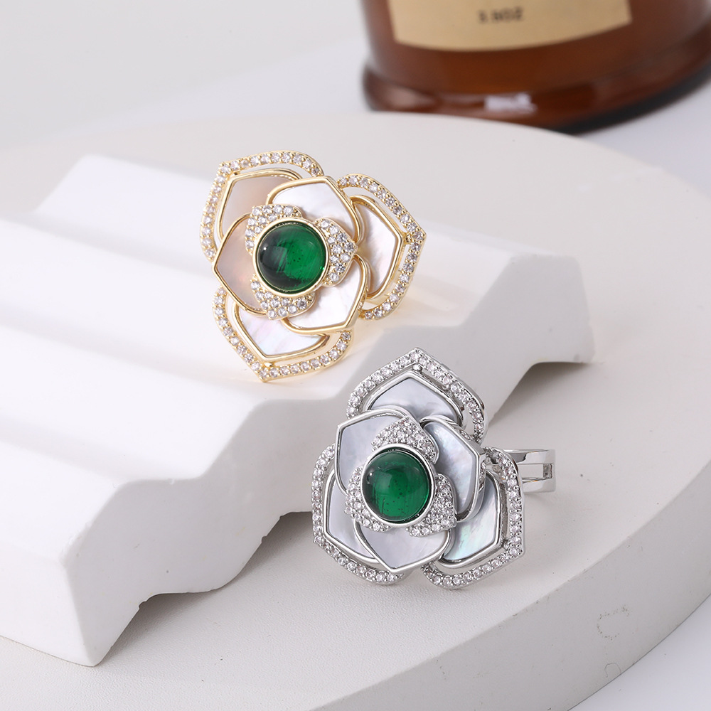 French-Style Romantic Clover Ring with Intricate Design, Multi-Layered Petal Ring, Natural Mother-Of-Pearl Inlaid with Emerald Jewelry