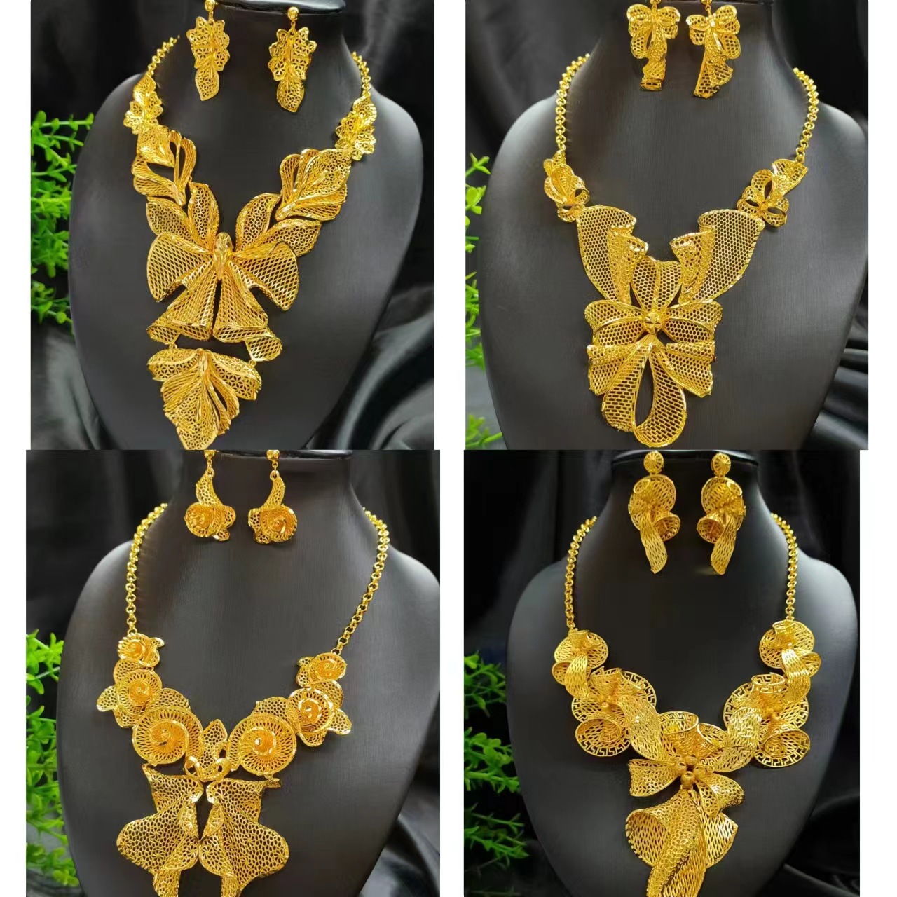 Cross-Border Dubai 24K Gold-Plated Brass Hollow Jewelry Set Necklace Middle East Africa Bride Necklace Earrings