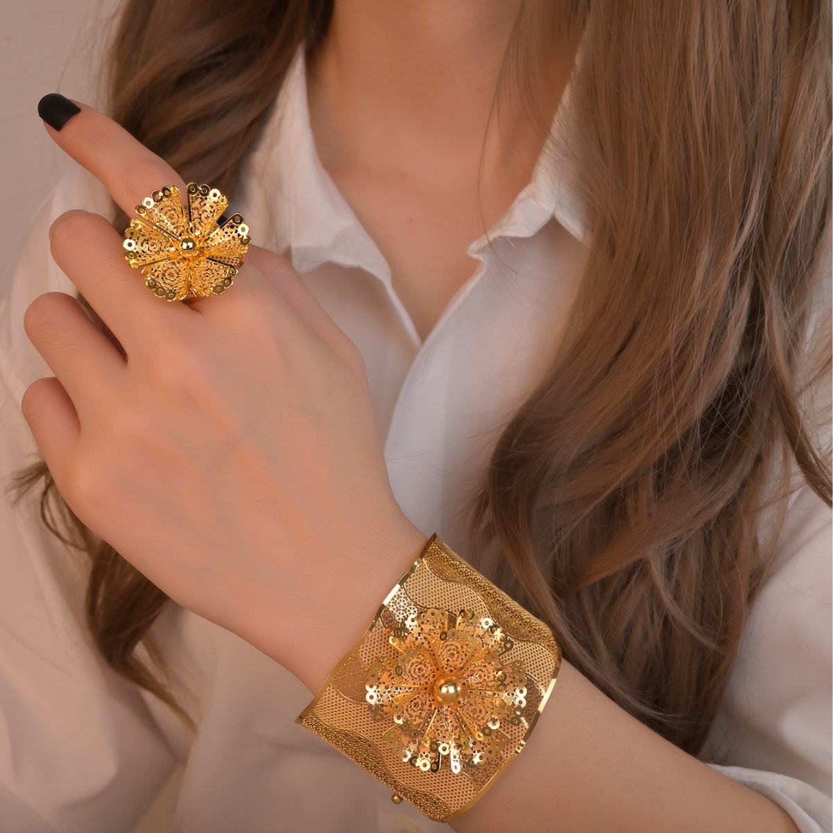 Dubai Gold-Plated Large Bracelet Ring Jewelry Set African Middle Eastern Women's Wedding Bride Jewelry Accessories Flowers
