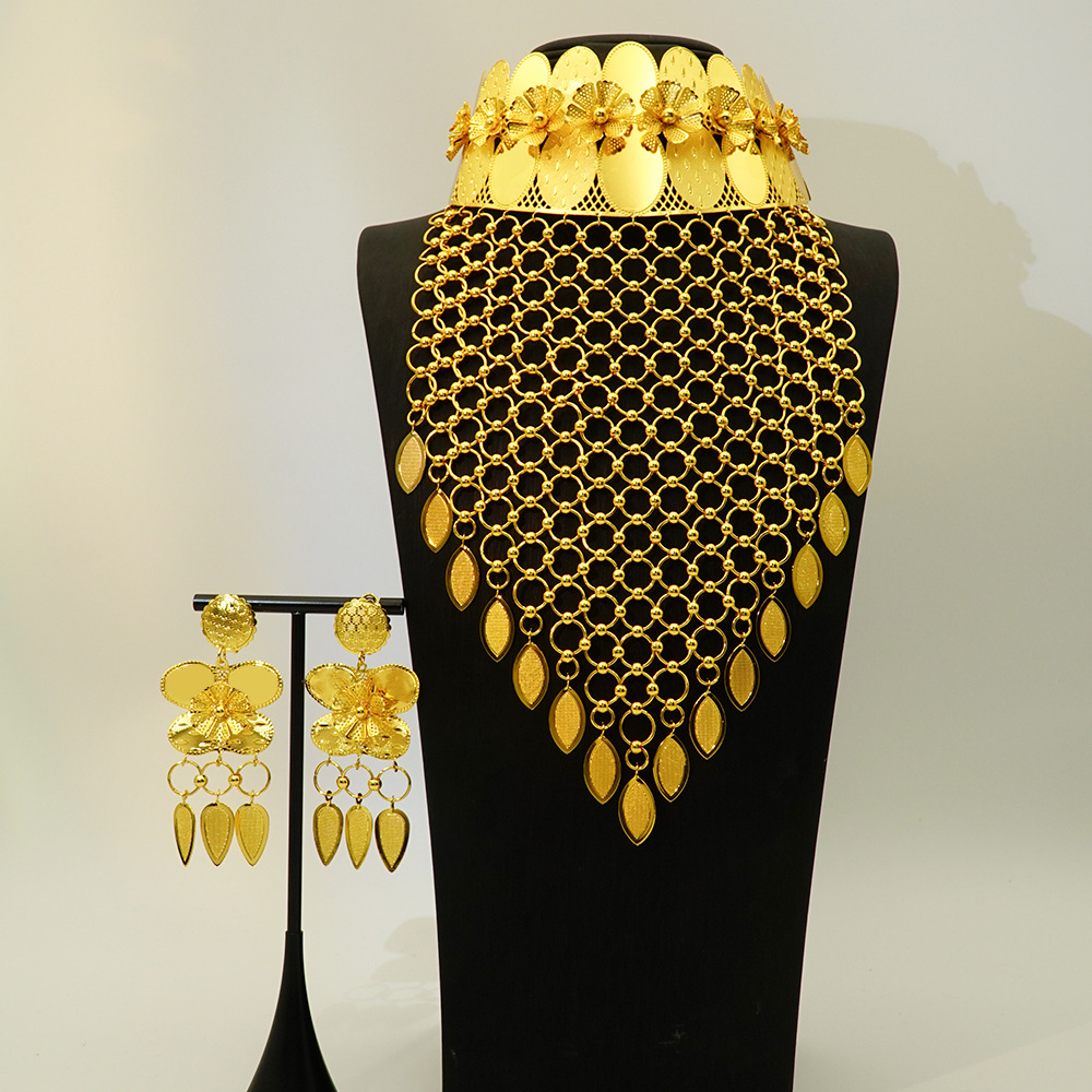 Dubai Exaggerated Gold Plated Flower Necklace Earrings Two-Piece Jewelry Set Middle Eastern Women's Wedding Party Jewelry Accessories