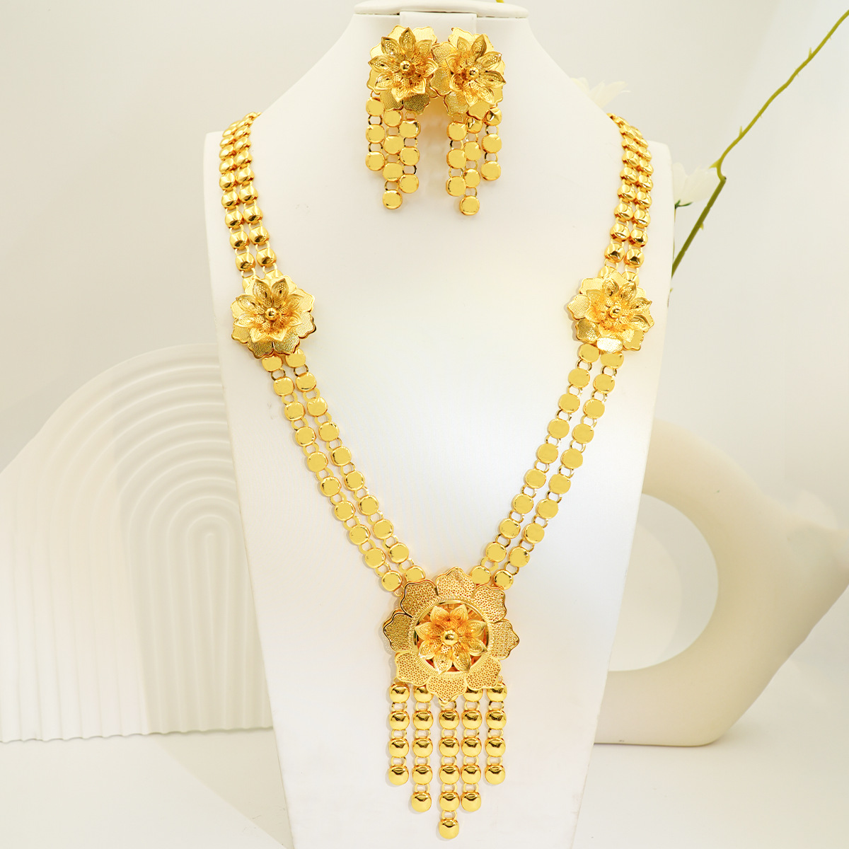 Long Dubai Gold-Plated Necklace Earrings Set African Jewelry Dubai Long Necklace Set