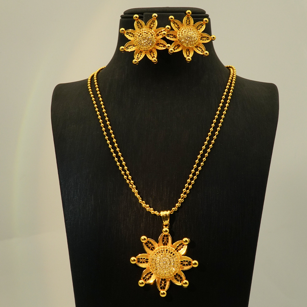 Cross-Border Hot Selling Flower Gold-Plated Copper Necklace Earrings Set African Middle East Dubai Bride Wedding Jewelry Set