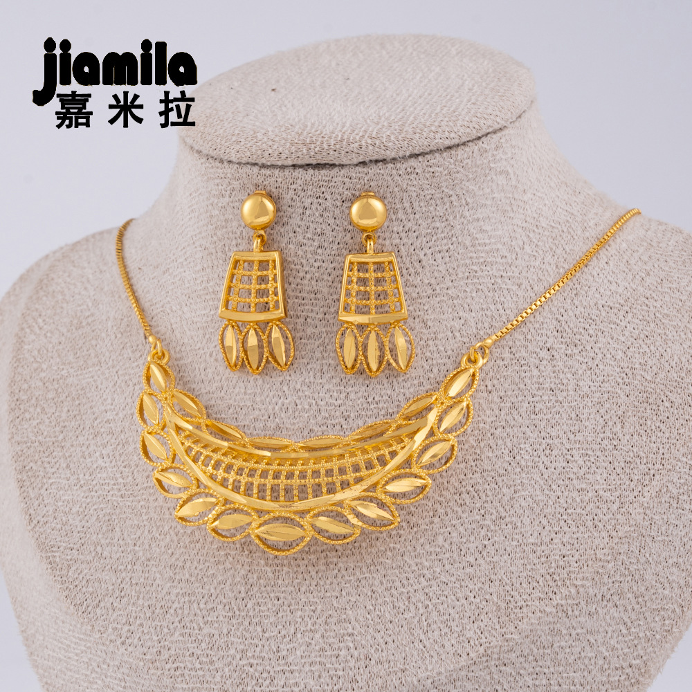 Cross Border 24K Gold Plated Alloy Dubai jewelry Set Necklace Earrings Indian Bride Wedding Two Piece jewelry