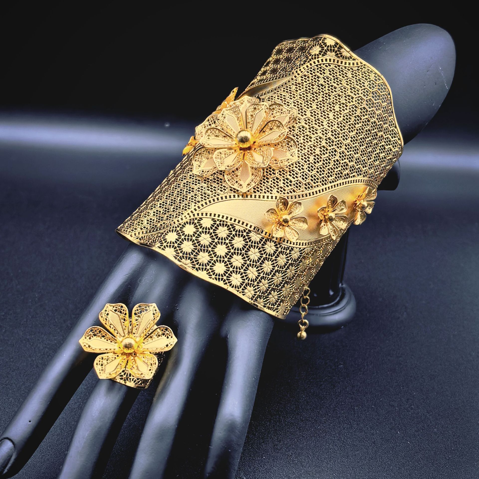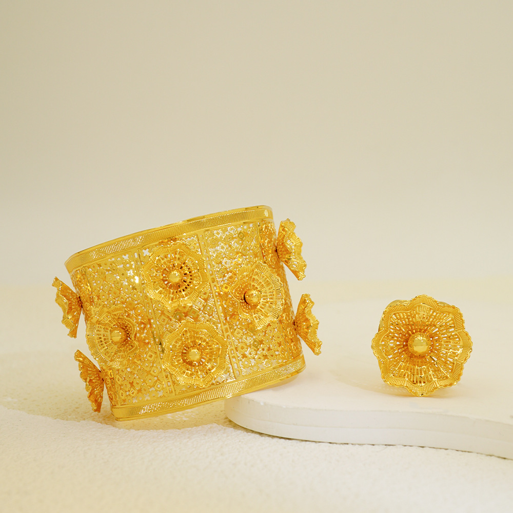 Cross Border 24k Gold Plated Flower Bracelet Ring suit Dubai India Nigeria Bride Sand Gold Bracelet Wholesale