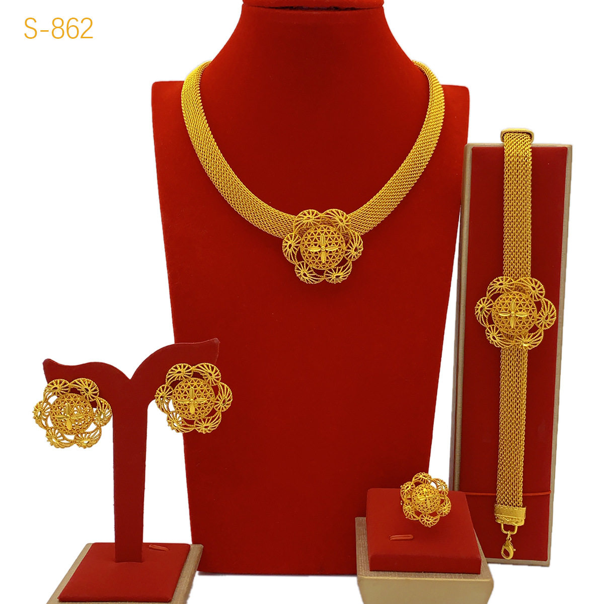 Cross-border Hot Sale Dubai Gold Jewelry Middle East Women's Necklace Earrings Ring Bracelet Not Easy to Fell Four-piece in stock