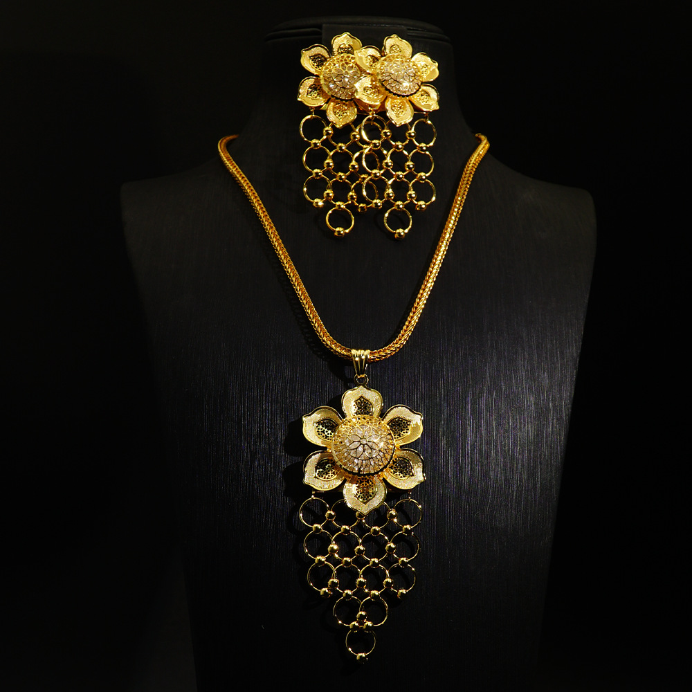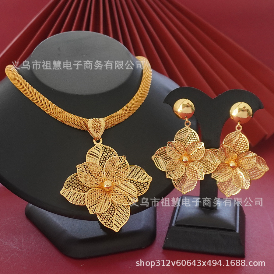 Middle East Cross-Border 24K Gold-Plated Flower Earrings Necklace Jewelry Set Dubai Ladies Bridal Wedding Accessories