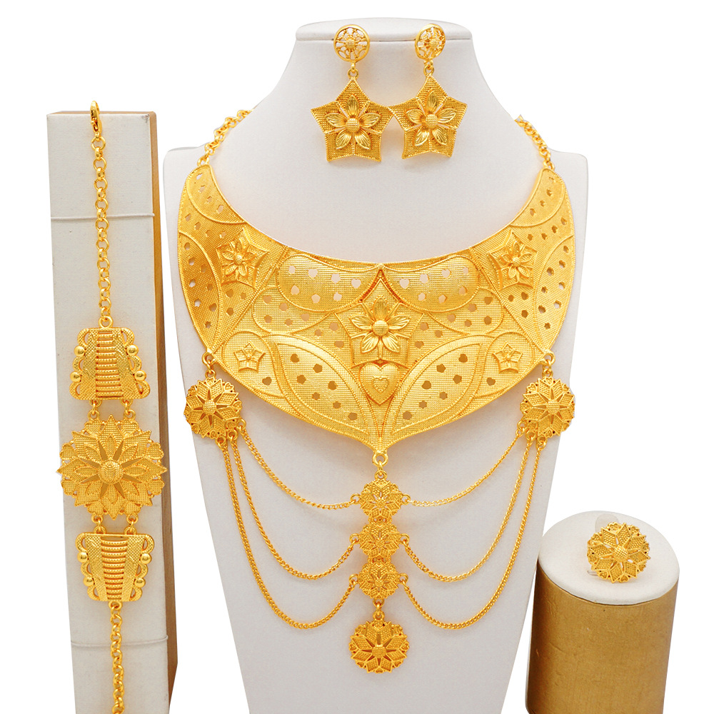 Cross Border 24K Gold Plated Set Dubai Saudi Jewelry Set Bride Wedding Necklace Earrings Ring Hand Four Piece Set