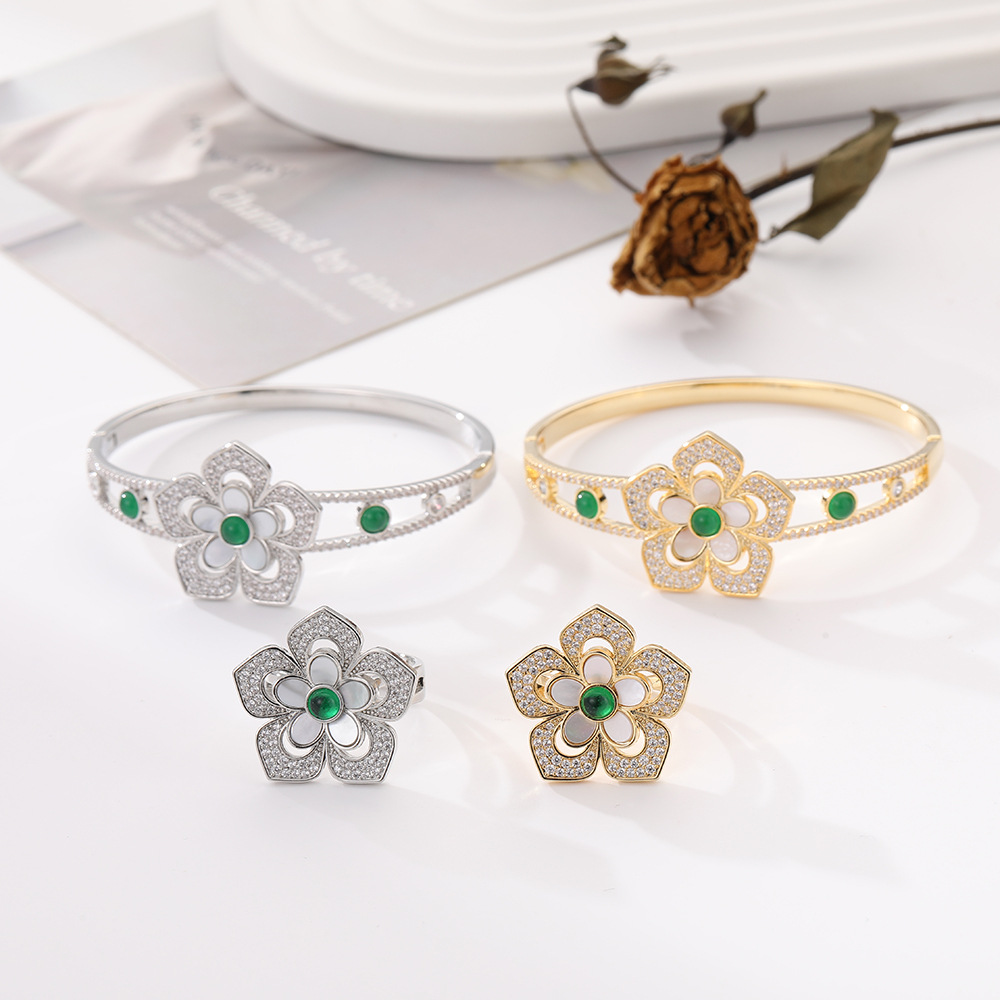 High-grade French Retro Court Style Ring Micro-inlaid Zircon Hollow Emerald Bracelet Ring suit