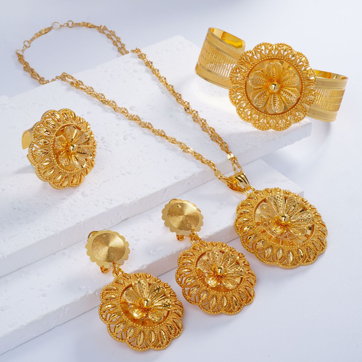 4-Piece Cross-Border Middle Eastern 24K Gold-Plated Flower Cut Out Necklace Bracelet Ring Earrings Set Dubai Bridal Wedding