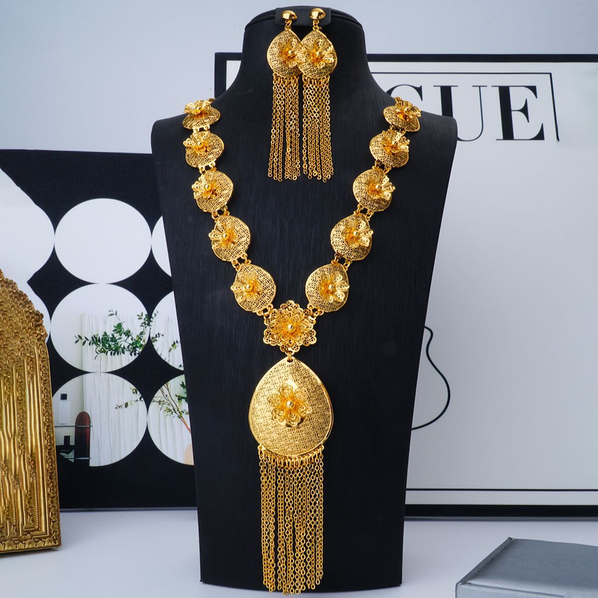 Luxurious Dubai Jewelry 24K Gold Hollow Flower Tassel Necklace and Earrings 2-Piece Set Wedding Banquet Accessories