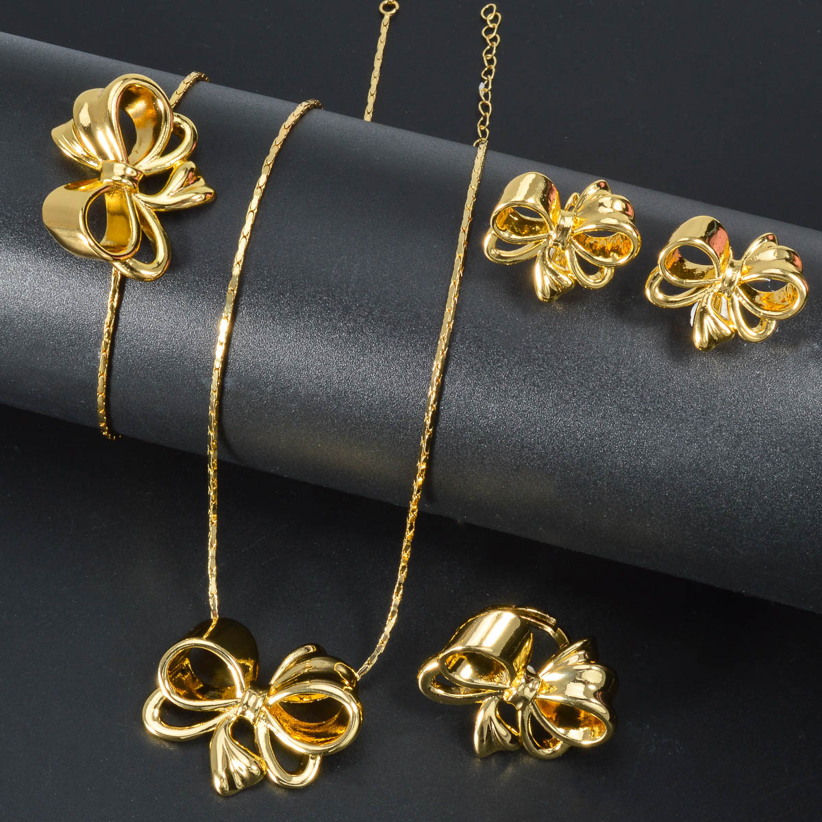 Dubai Gold Fashion Jewelry Set Three-Dimensional Bow Simple Four-Piece Necklace Bracelet Earrings Ring Set