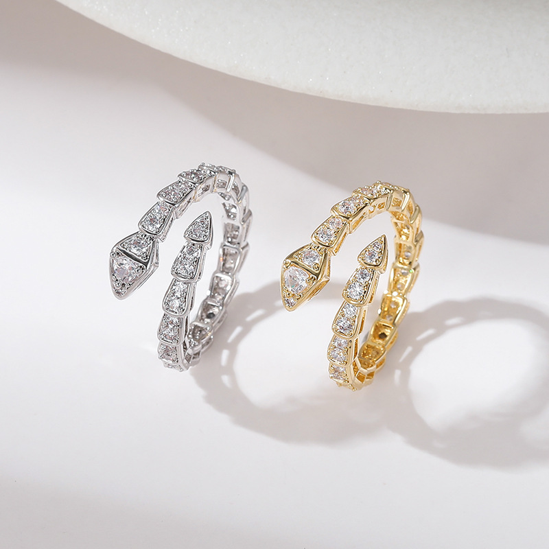 Full Diamond Snake-Shaped Open Ring Exquisite Ring Niche High-End Copper Jewelry Cross-Border European and American Gold-Plated Hand Jewelry Wholesale for Women