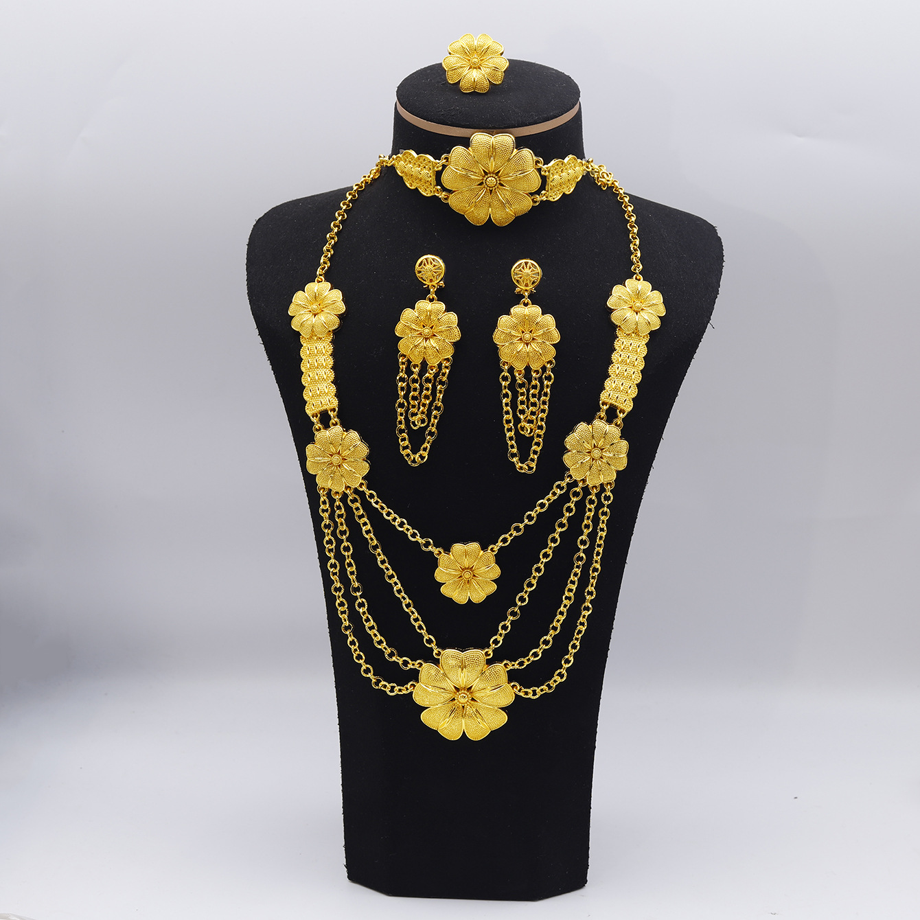 Cross-border Middle East Plated 24K Gold Flower Necklace Ring Bracelet Earrings suit Dubai European and American Bride Wedding Jewelry
