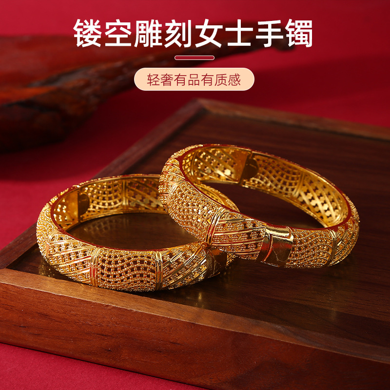 Dubai Versatile 24K Gold-Plated Large Bracelet Alloy Cut Out Pattern Design Southeast Asian Ladies Wedding Exaggerated