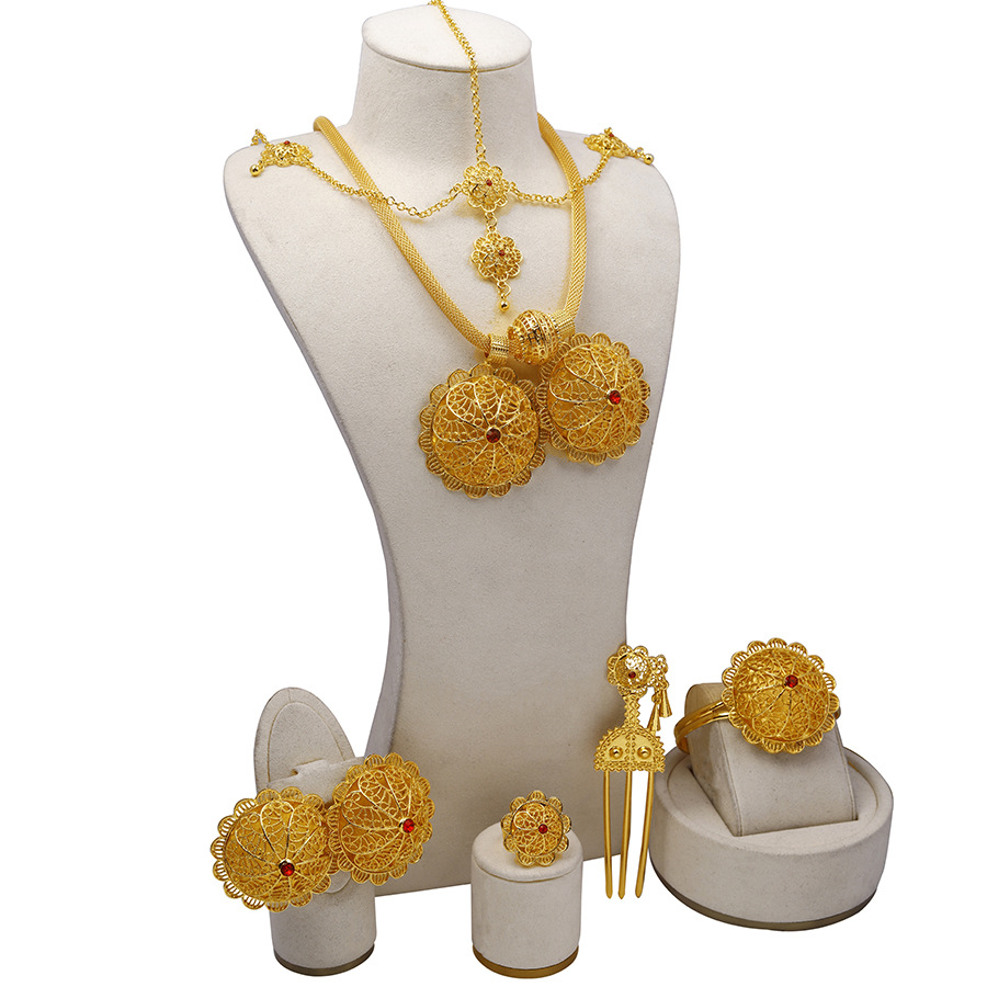 Cross-border New Dubai Zinc Alloy Plated 24K Gold Jewelry Set African Bridal NecKlace Earrings Ring Bracelet Hair