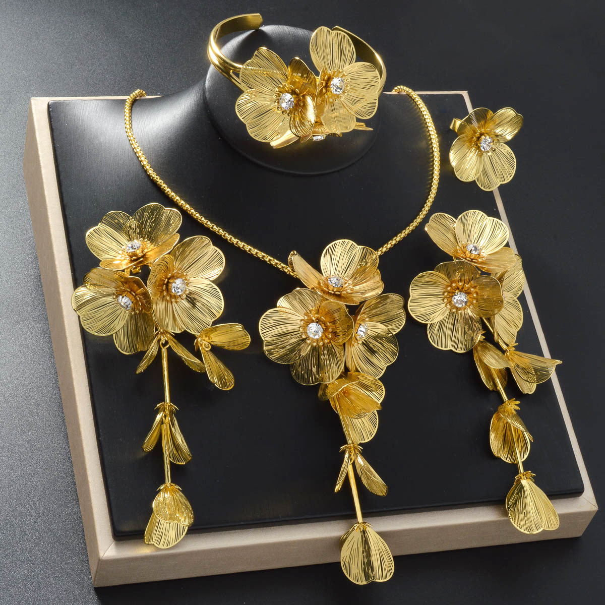 Imitation Gold Flower Necklace Earrings Bracelet Ring Jewelry Set 24k Copper Gold Plated Dubai India Bride Jewelry
