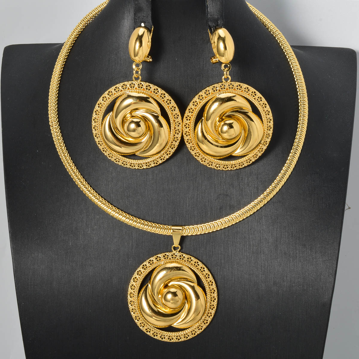 Cross-Border Dubai Bride Ancient Gold Jewelry Round Flower Set Pendant Earrings Necklace Nigerian Women's Wedding